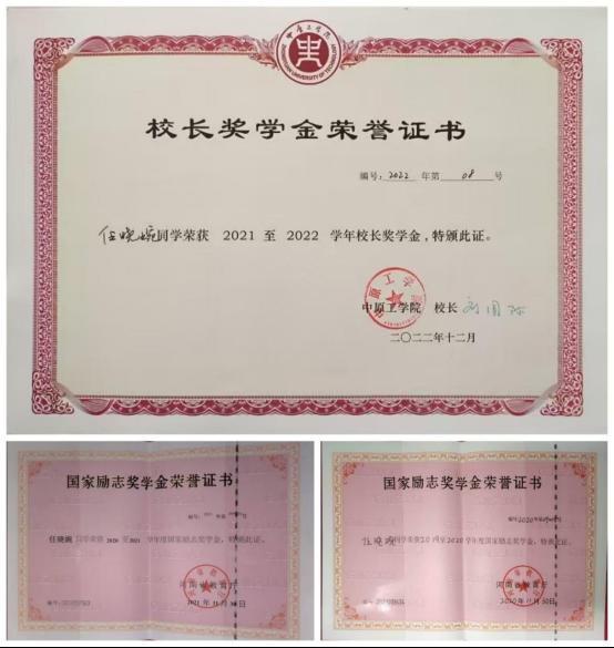 她总是严格要求自己,课堂上她全神贯注,课后温故知新。宿舍、自习室、图书馆、小树林里的桌椅、运动场上的路延都是她课下学习的地点。她说:“学习难免会有惰性,每学期给自己设定一个小目标,有了目标,才有前进的动力和努力的方向。”英语四级就是她定下的第一个目标,她利用大一固定的早晚自习时间来学习英语,背单词、做阅读、找作文模板,通过每天的学习积累,大一下学期顺利通过英语四级考试。拿下了第一个目标,她对自己接下来的目标也有了拟定的方向和信心。于是奖学金、参加数学建模竞赛、英语六级、入党等等目标都分别列在了她每学期的计划里,每完成一项她会奖励自己一个在能力范围内的小礼物。通过老师的指导,自己的勤奋努力,她一步步实现了自己的目标。在校期间,德育素质测评成绩均为优,学年成绩排名多次年级第一,大二下学期通过英语六级考试。曾获董事长奖学金、国家励志奖学金3次。