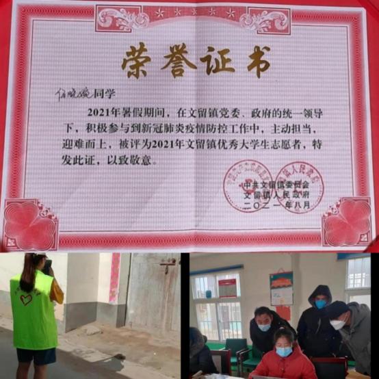 她曾受助于国家助学贷款、助学金。便将回报之情投入到服务社会的志愿活动中。利用假期,主动参与到自己家乡的“三下乡”活动,在家乡社区疫情防控工作中,主动担当,迎难而上,表现优异,被评为“2021年文留镇优秀老员工志愿者”。