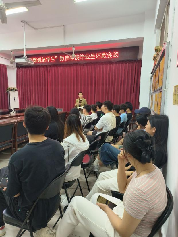 为进一步做好国家助学贷款的贷后管理工作,增强毕业生助学贷款诚信还款意识,beat365于4月25日举行争做“诚信员工”毕业生还款教育会议,2024届全体贷款毕业生参加。学工办副主任陈婷主持会议。